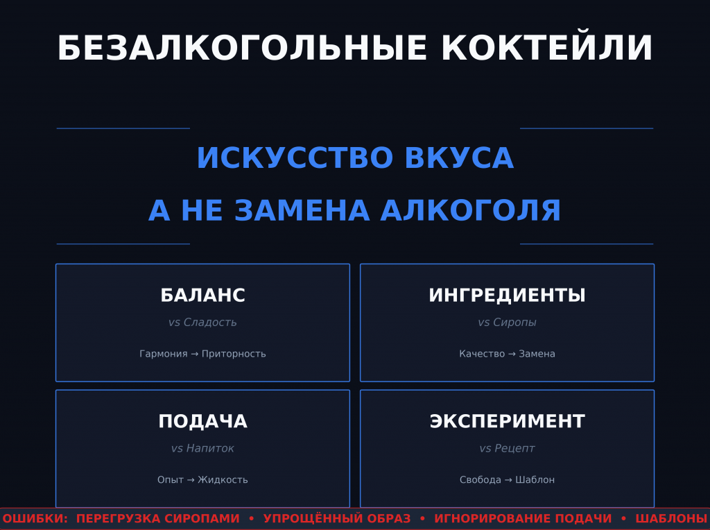 Идея замены алкоголя фруктами и сиропами приводит к тому, что многие делают коктейли без должного внимания к балансу вкусов и гармонии ингредиентов.