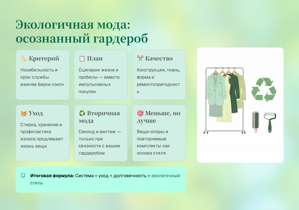 Экологичная мода начинается не с лозунгов, а с практики: покупать меньше, носить больше и ухаживать так, чтобы вещи жили дольше. Осознанный гардероб строится на носибельности, а значит — на посадке, комфорте и сочетаемости. Когда вы собираете систему опорных вещей под свои сценарии, импульсивных покупок становится меньше, а стиль становится устойчивее. Экологический эффект возникает как следствие: меньше замен, меньше «одиночек», меньше выброшенного.