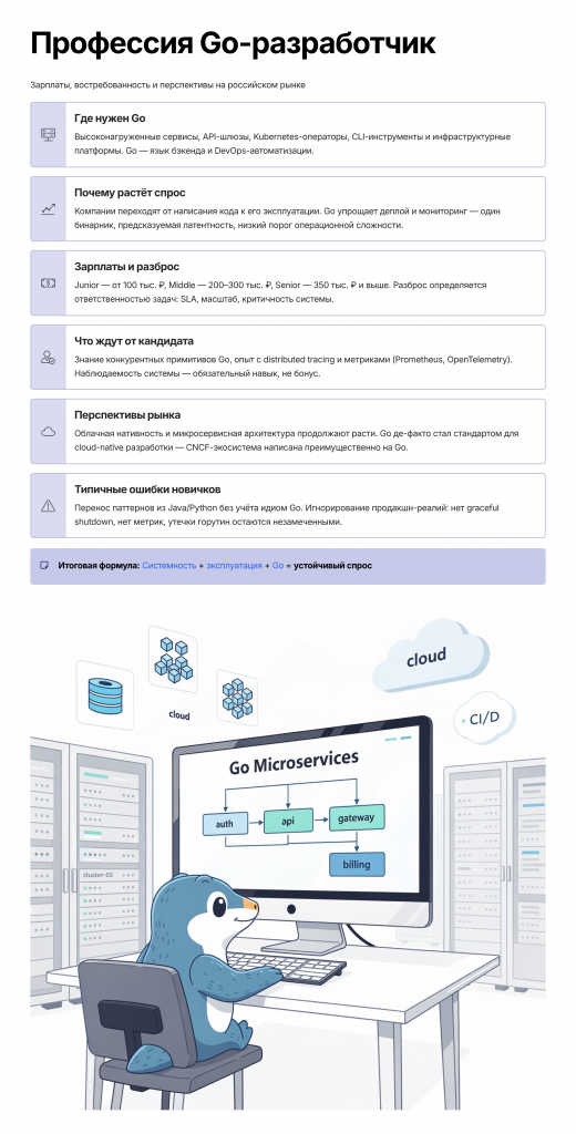 Профессия Go-разработчика держится на спросе со стороны компаний, которым важны предсказуемость, устойчивость и управляемость сервисов. Зарплаты в Go нередко выше среднего, потому что задачи чаще связаны с инфраструктурой и высокой ответственностью, но реальная «премия» появляется там, где требуется инженерная зрелость, а не просто знание языка. Перспективы Go выглядят устойчиво: он остаётся сильным выбором для сервисов под нагрузкой и инфраструктурных компонентов, где сложность нужно держать под контролем. Для разработчика это означает понятный путь роста — через расширение контекста эксплуатации и системного мышления, а не через накопление «фишек» синтаксиса.