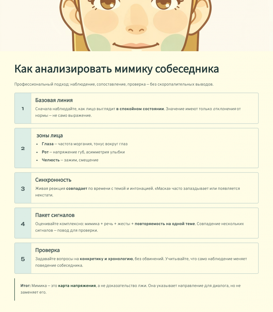 Без проверки мимика превращается в повод для подозрений, а не в инструмент понимания.