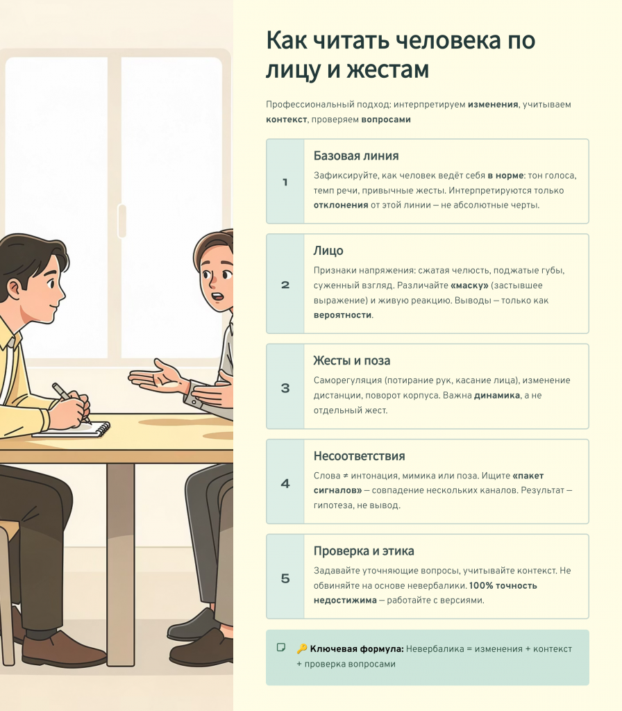Именно такой подход делает тему «Как читать человека по лицу и жестам» полезной в работе, переговорах и отношениях: вы не превращаете наблюдение в обвинение, а используете его, чтобы лучше задавать вопросы и снижать риск недопонимания.
