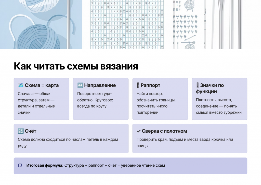 В статье разобрано, как читать схемы: видеть структуру, понимать направление, работать с раппортом и счётом и переводить значки в действия по полотну.