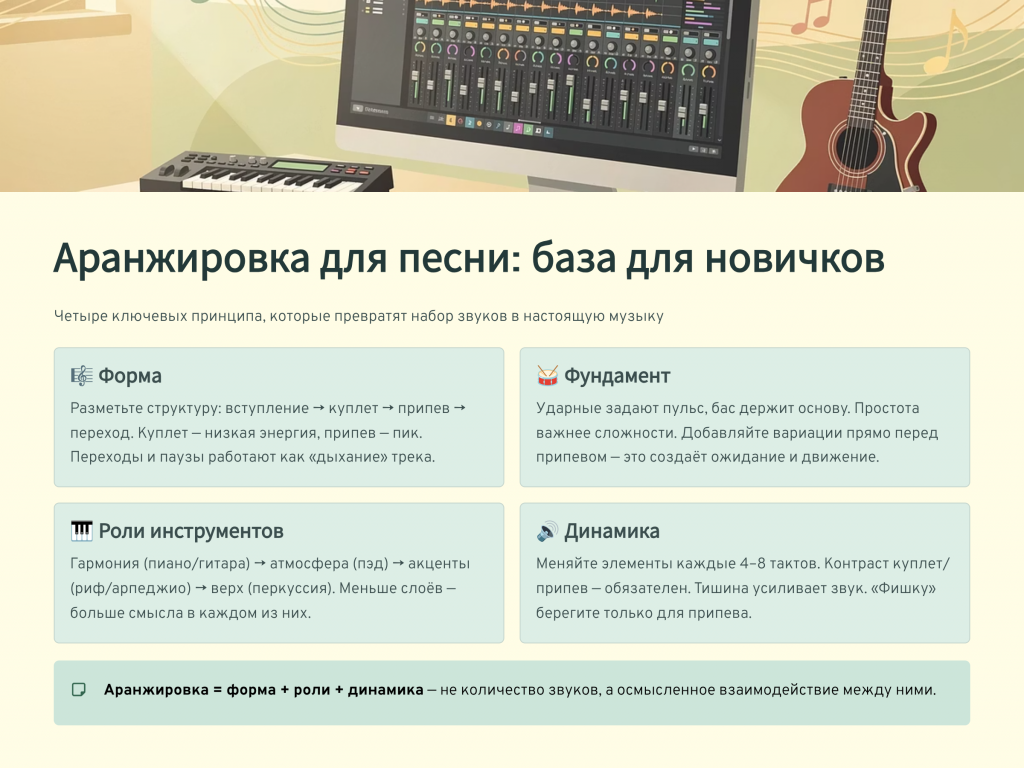В статье разобраны основы: каркас формы, ритм-секция, роли инструментов, контраст куплет/припев и управление динамикой.