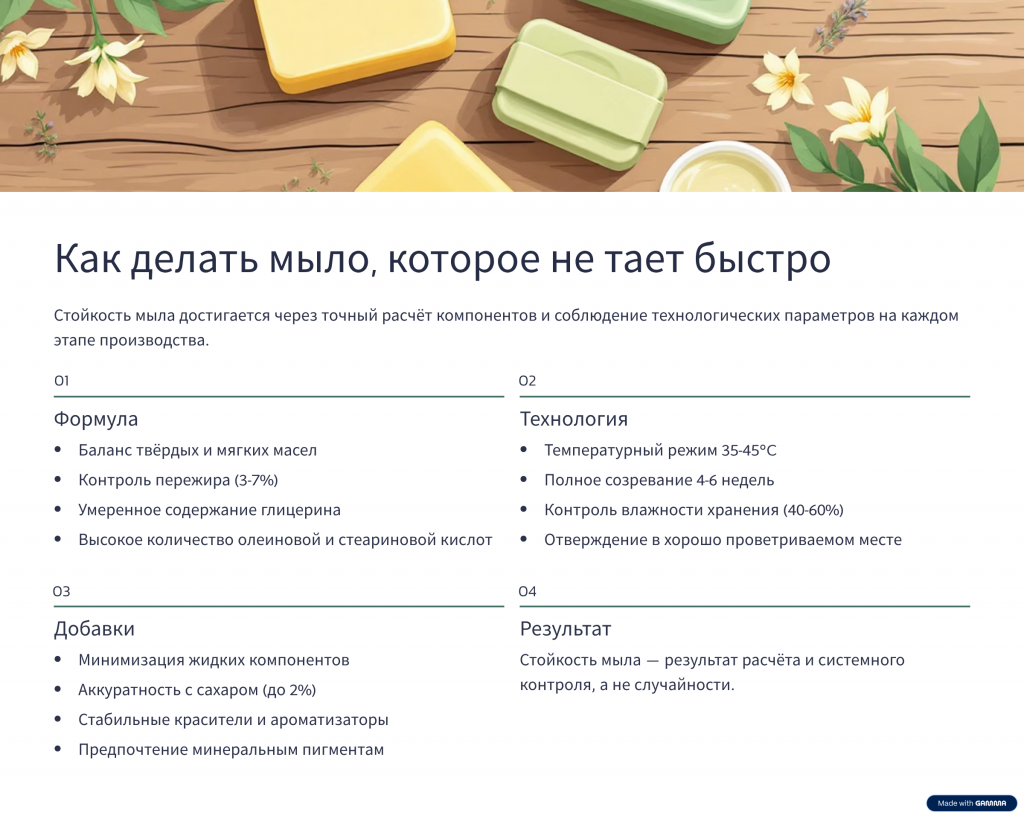 Понимание причинно-следственных связей позволяет управлять свойствами изделия и создавать продукт, который сохраняет форму и служит дольше. Именно такой подход превращает мыловарение в профессиональное ремесло.