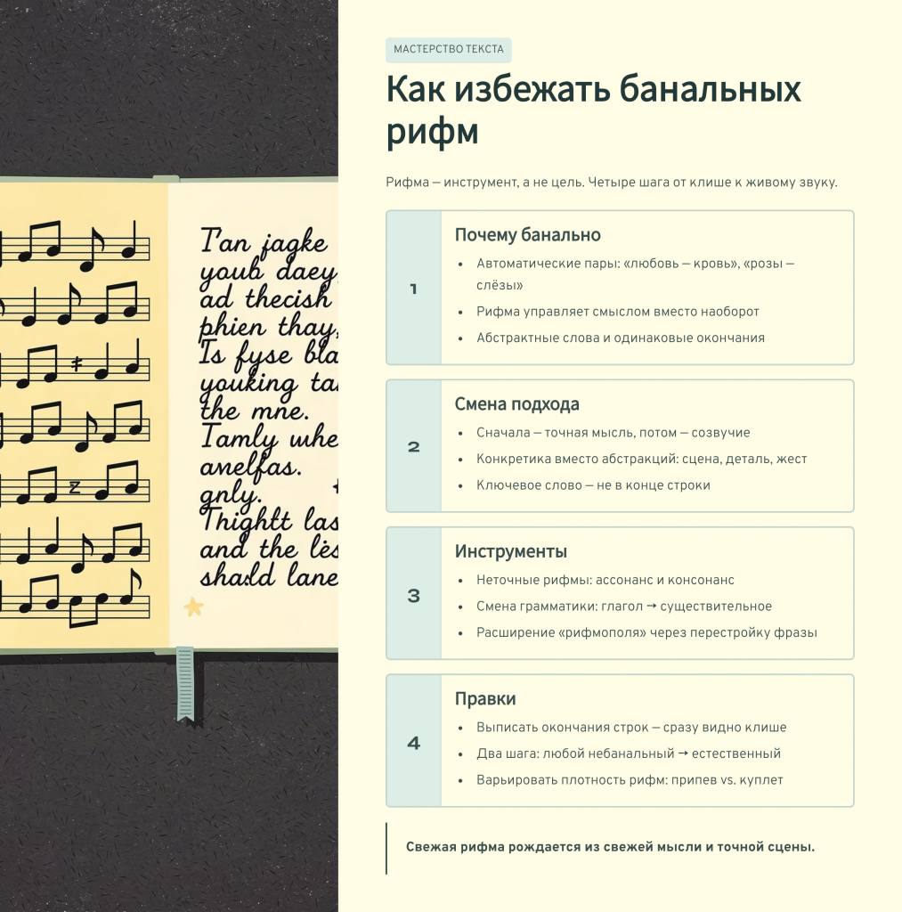 Когда вы задаётесь вопросом «Как избежать банальных рифм», подумайте не только о словах, но и о функции. В припеве рифма может быть проще, потому что работает повтор и мелодия. В куплетах лучше избегать самых ожидаемых пар, потому что именно куплеты создают ощущение авторского голоса.