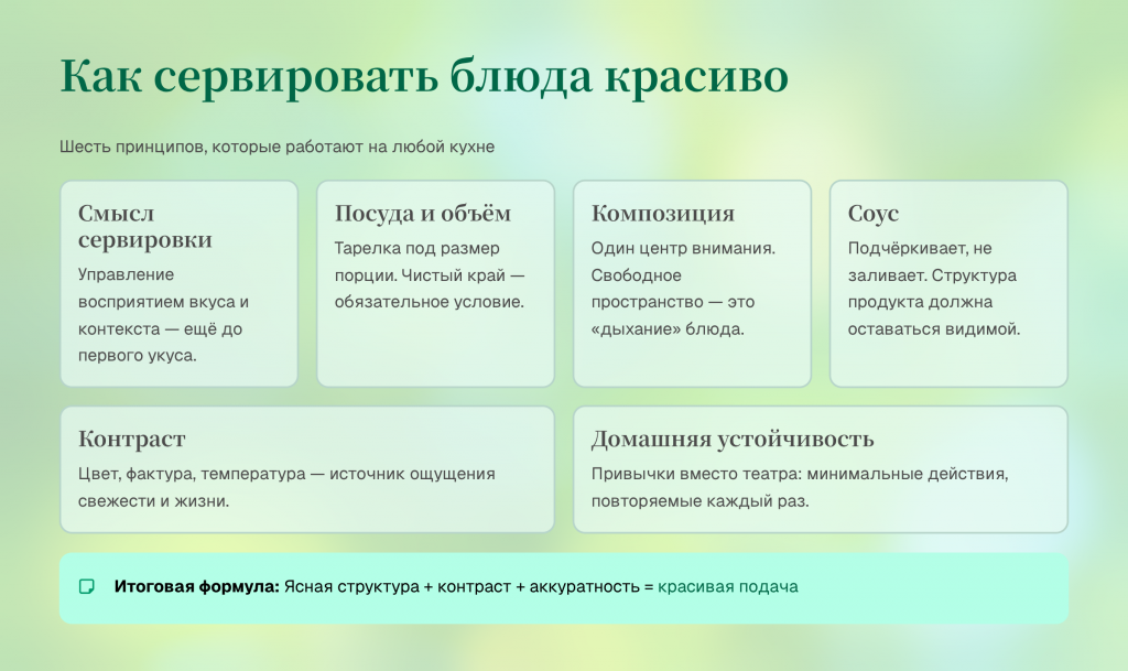 Красивая сервировка — это способ сделать блюдо собранным и понятным, а не попытка заменить вкус внешним эффектом. Она работает через простые принципы: правильная посуда под объём, чистый край, ясный центр композиции, пространство на тарелке и видимая структура продукта. Контраст по цвету и фактуре делает даже простую еду живой, а контроль соуса и температуры помогает сохранить свежесть и аккуратность.