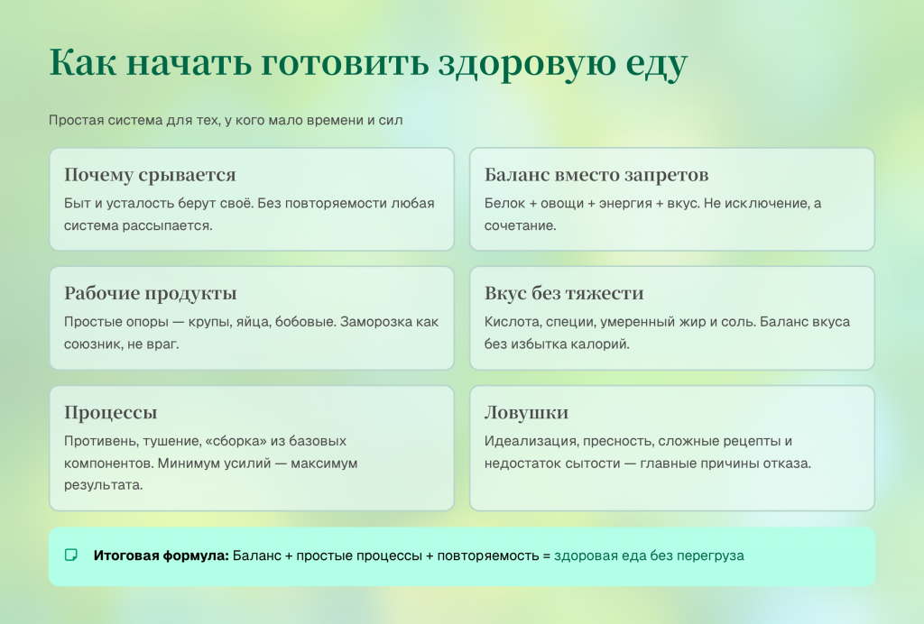 Устойчивость возникает из процессов: запекание, тушение, сборка блюд из базовых компонентов и небольшие заготовки, которые экономят решения в будни. Самые частые провалы связаны с идеализацией, пресностью, слишком сложными рецептами и неправильными закупками. Если мыслить трезво и строить «достаточно хорошую» систему, здоровая еда перестаёт быть проектом и превращается в спокойную часть повседневной жизни.