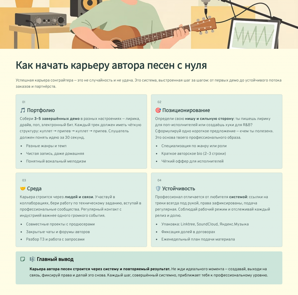 Тема «Как начать карьеру автора песен с нуля» сводится к трём вещам: портфолио, среда и повторяемость результата. Сначала вы создаёте несколько завершённых демо, затем регулярно показываете их людям в индустрии и параллельно развиваете навык работы по задачам. Дальше подключаются коммуникации, понимание прав и финансовая грамотность. Карьера автора строится не одним шансом, а серией небольших действий, которые со временем складываются в устойчивую профессиональную роль, где вас знают, понимают и зовут работать снова.