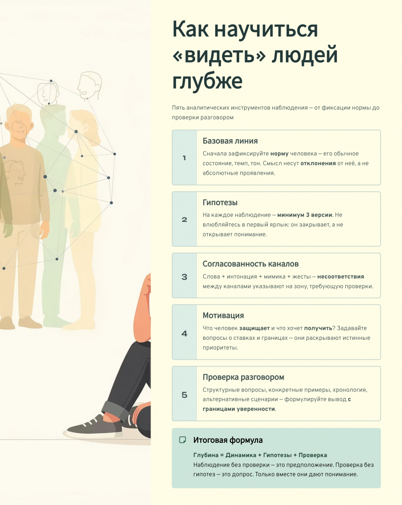 И наконец, глубина — это этика. Если вы используете наблюдения как способ получить власть, вы быстро перестанете видеть человека: вы будете видеть только свои подозрения. А если вы используете наблюдения, чтобы лучше понимать и точнее общаться, вы действительно начинаете «видеть» глубже — потому что меньше проецируете и больше проверяете реальность.