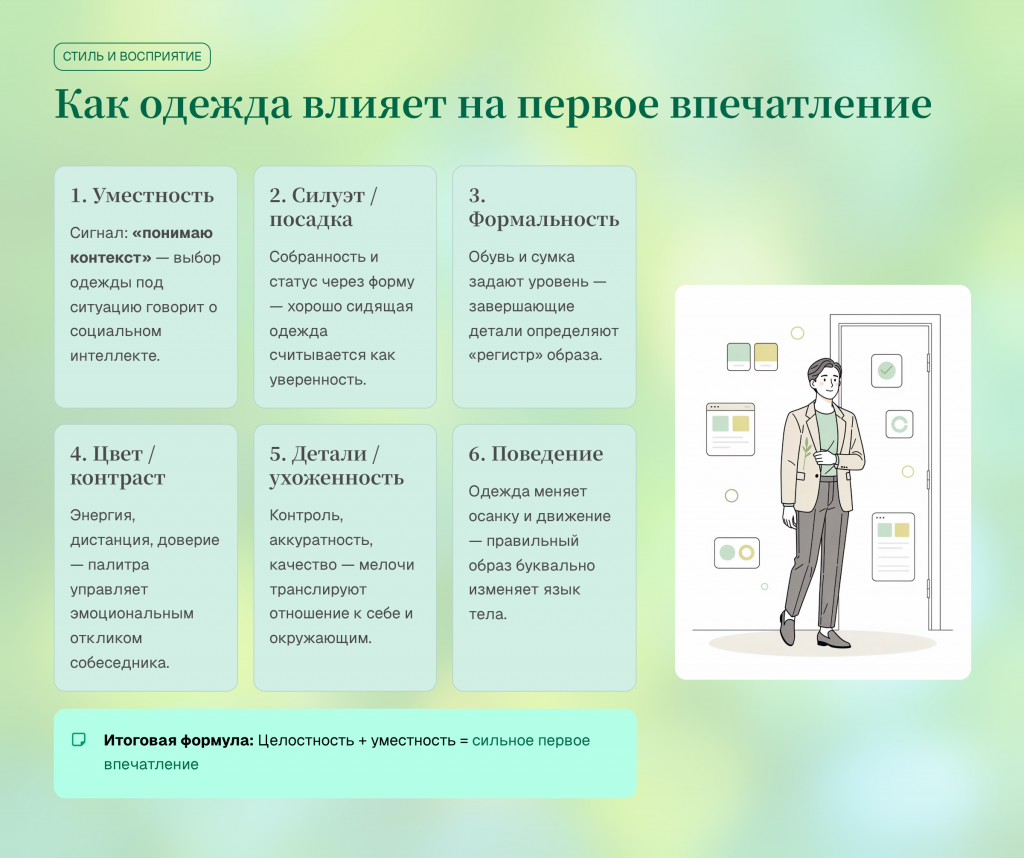 Это происходит потому, что мозг считывает визуальные сигналы быстрее слов: уместность, силуэт, детали и ухоженность формируют ожидания мгновенно.