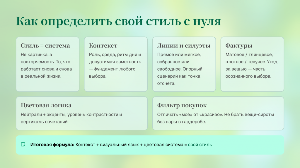 «Свой стиль» — это не образ из головы, а рабочая система, которая выдерживает жизнь