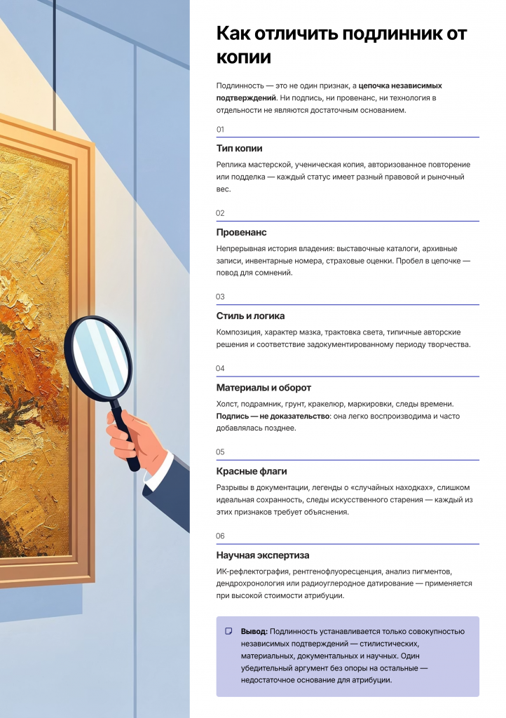 В статье разобрана логика различения: тип копии, происхождение, стиль, материалы и научные методы.