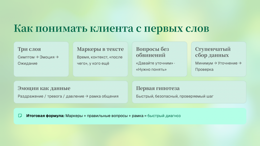 - Первые слова — это не «суть проблемы», а смесь симптома, эмоции и ожидания