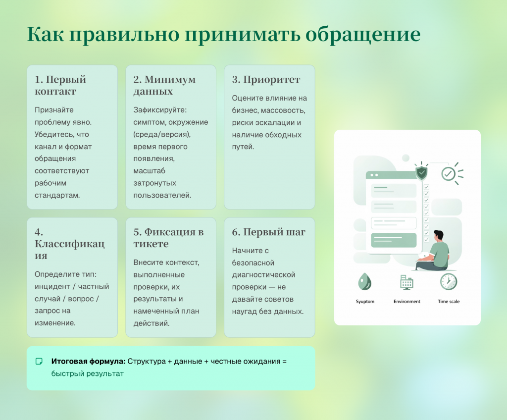 В статье разобрано, как принимать обращение профессионально: задать тон, собрать минимум данных, оценить влияние, оформить тикет и выбрать первый проверяемый шаг.