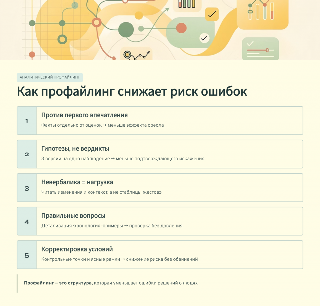 Как профайлинг снижает риск ошибок? Он превращает оценку людей из интуитивной реакции в структурированную аналитику. Он ослабляет эффект первого впечатления, заставляет держать альтернативные версии, снижает мифологизацию невербалики и учит проверять гипотезы правильными вопросами. В результате вы реже ошибаетесь в мотивах, точнее оцениваете надёжность и лучше управляете условиями взаимодействия, не разрушая доверие преждевременными обвинениями.