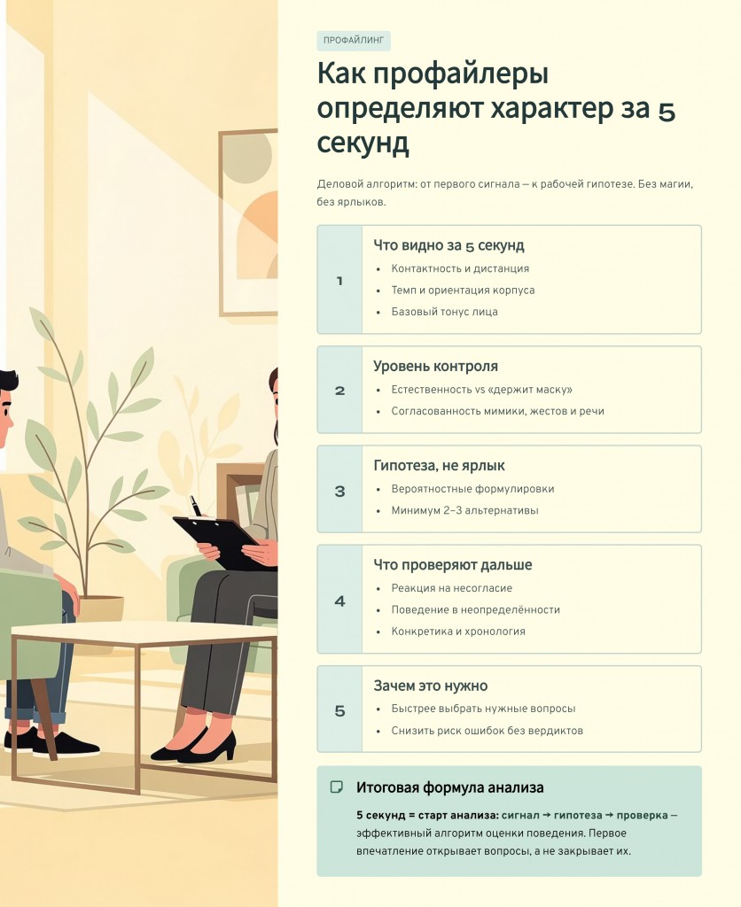 Как профайлеры определяют характер за 5 секунд? В строгом смысле — не определяют. Они делают первичную гипотезу по входным сигналам: контактность, контроль, базовая эмоциональная нота, стратегия самопрезентации. Эти сигналы помогают выбрать, что проверять дальше: ответственность, реакцию на несогласие, поведение в неопределённости, способность держать конкретику и устойчивость версии во времени.