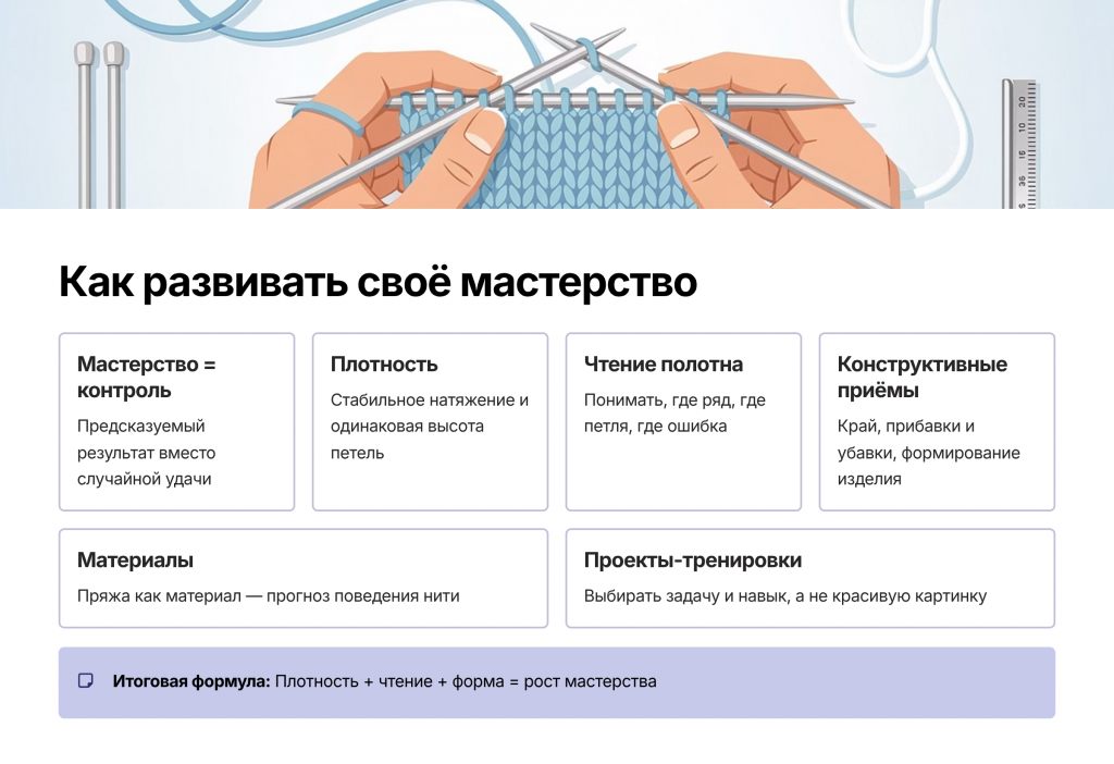 В статье разобрано, как развивать мастерство системно: укреплять плотность, тренировать «чтение» вязания, расширять конструктивные приёмы и выбирать проекты под навык.