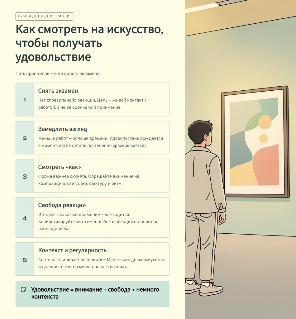 Когда вы спрашиваете, как смотреть на искусство, чтобы получать удовольствие, ответ часто оказывается очень практичным: меньше спешки, больше внимания, больше свободы реакции, немного контекста и регулярность. Всё это не требует «таланта», но меняет качество опыта.