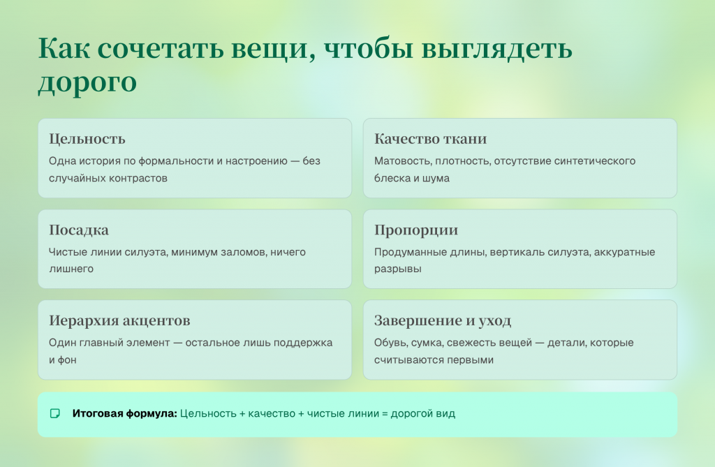 Это происходит потому, что дороговизна считывается по цельности, качеству ткани, посадке и состоянию вещей, а не по громкости сигналов.