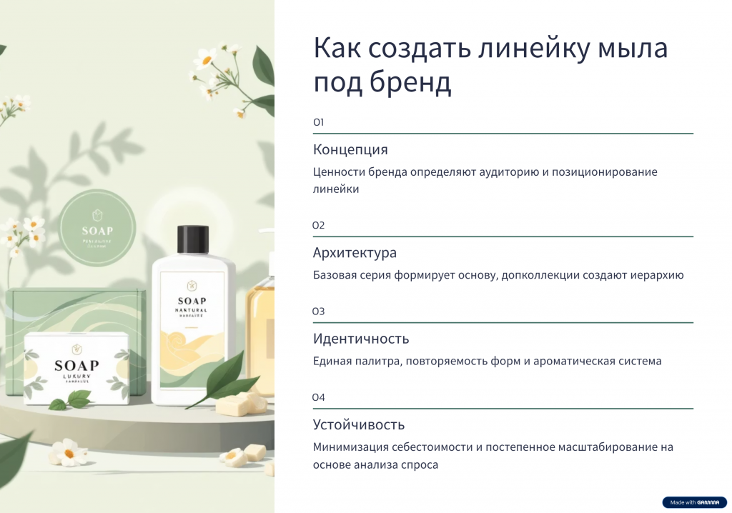 Если смотреть на линейку профессионально, это всегда архитектура. В архитектуре важны опоры, пропорции, повторяемость элементов, иерархия и смысловые зоны. В ассортименте то же самое: должны быть базовые позиции, которые формируют устойчивость производства и продаж; должны быть поддерживающие продукты, которые расширяют выбор, но не размывают фокус; должны быть акценты, которые создают эмоциональную глубину и выделяют бренд на фоне однотипных предложений. Когда вы понимаете, как создать линейку мыла под бренд, вы начинаете мыслить не «изделиями», а «пользовательским опытом» и «сценариями покупки».