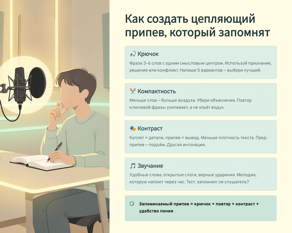 Цепляющий припев — это не случайная удача и не «просто хороший вкус». Это конструкция: крючок, компактность, повтор, контраст с куплетом, удобство звучания и мелодическая повторяемость. Когда вы меняете задачу с «написать красиво» на «сделать запоминаемым», у вас появляется контроль над результатом.