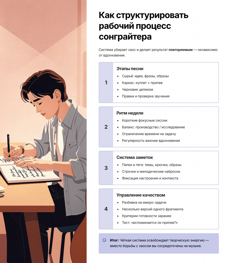 В статье разобрана структура работы сонграйтера: этапы создания песни, ритм недели, система заметок и принципы контроля качества.