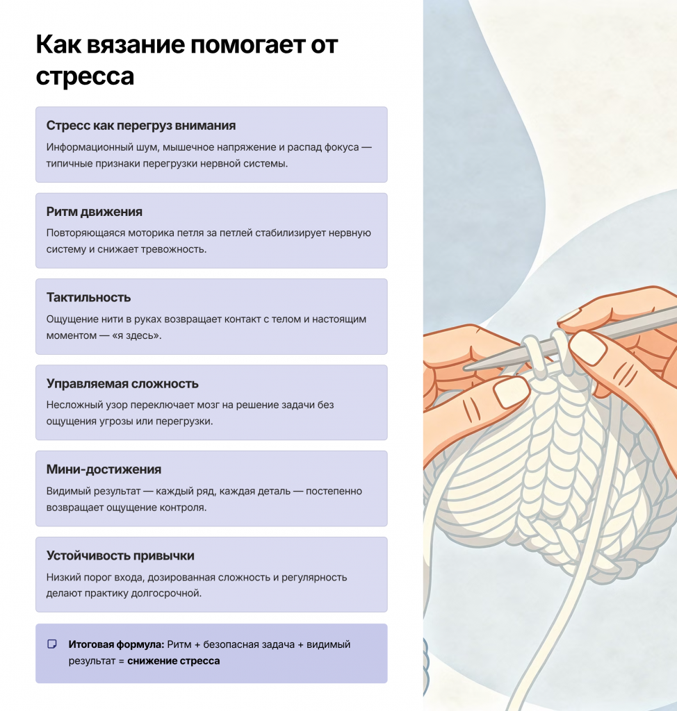 В статье разобрано, какие механизмы делают вязание антистрессовым: повторяемость, управляемая сложность, тактильность и устойчивые сценарии.