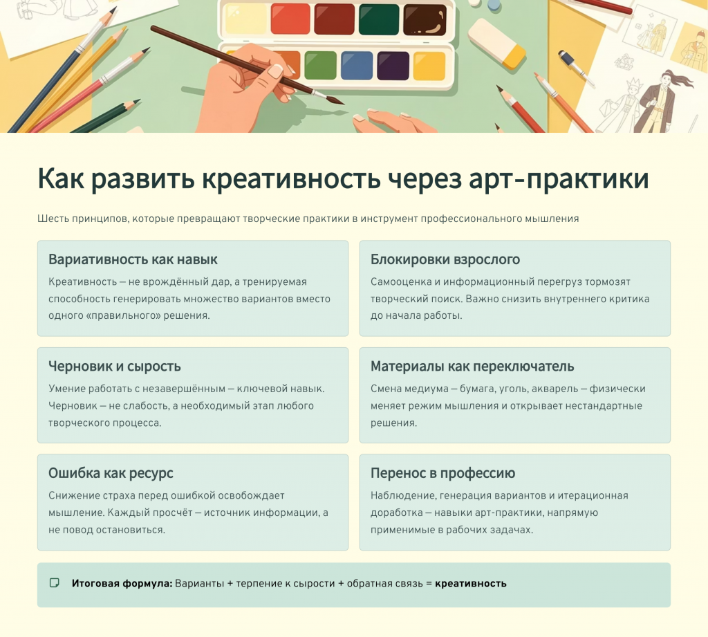 Развивать креативность через арт-практики — значит тренировать не талант, а способность производить варианты и выдерживать неопределённость. Материал помогает менять стиль мышления, а безопасный черновик учит отделять процесс от оценки и превращать ошибку в ресурс. Со временем креативность становится прикладной: она проявляется в том, как человек строит решения, как переносит промежуток сырости и как управляет условиями своей работы, не ожидая идеального настроя. В этом смысле арт-практики — не про «художественность», а про взрослую гибкость и умение действовать, когда ответа ещё нет, но движение уже возможно.