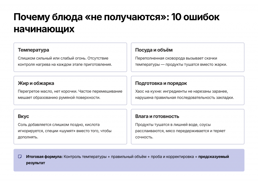 В статье разобраны типовые ошибки, из-за которых блюда «не получаются», и логика, которая помогает сделать результат предсказуемым.