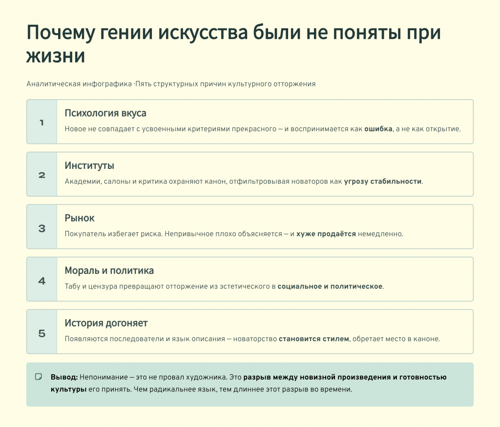 Почему гении искусства были не поняты при жизни? Потому что новое нарушает привычные критерии вкуса, институции защищают стабильность, рынок избегает риска, а содержание иногда конфликтует с моралью и политикой. Непонимание часто возникает не из отсутствия интеллекта у зрителей, а из отсутствия языка для чтения нового. Когда язык появляется — через время, через исследования, через последователей — общество начинает видеть то, что раньше не могло распознать.