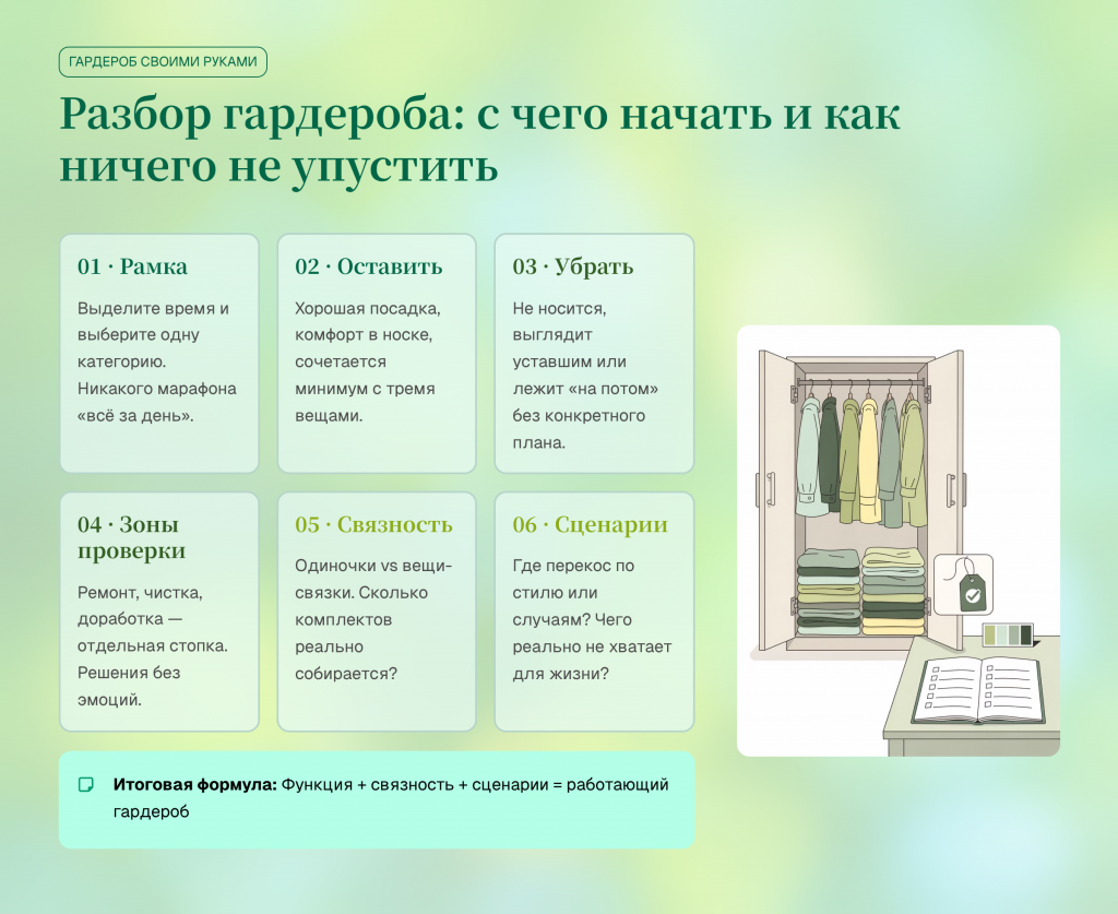 В статье разобрано, как провести разбор своими руками: выстроить рамку, выбрать критерии, убрать шум и проверить гардероб на реальные сценарии.