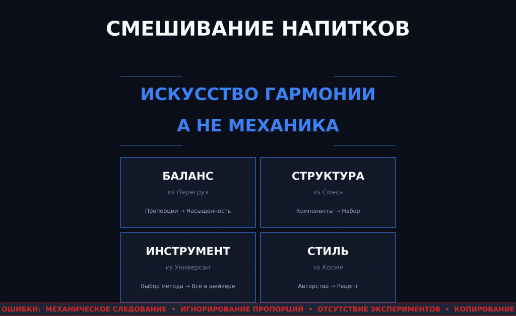 Смешивание напитков — это не просто набор шагов для создания коктейля. Когда начинающий бармен воспринимает этот процесс как механическое следование рецепту, он упускает важнейшую часть профессии. На самом деле, смешивание напитков — это искусство, в котором каждый ингредиент должен быть выбран и использован с учётом вкусовых сочетаний, текстуры и контекста. Простое следование инструкциям приводит к созданию напитков без вкусовой глубины, а правильное понимание процесса смешивания открывает перед барменом целый мир возможностей.