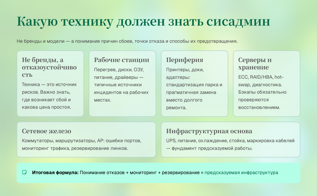 В статье разобрано, какую технику важно понимать сисадмину и почему это знание про надёжность, мониторинг и восстановление, а не про каталоги устройств.