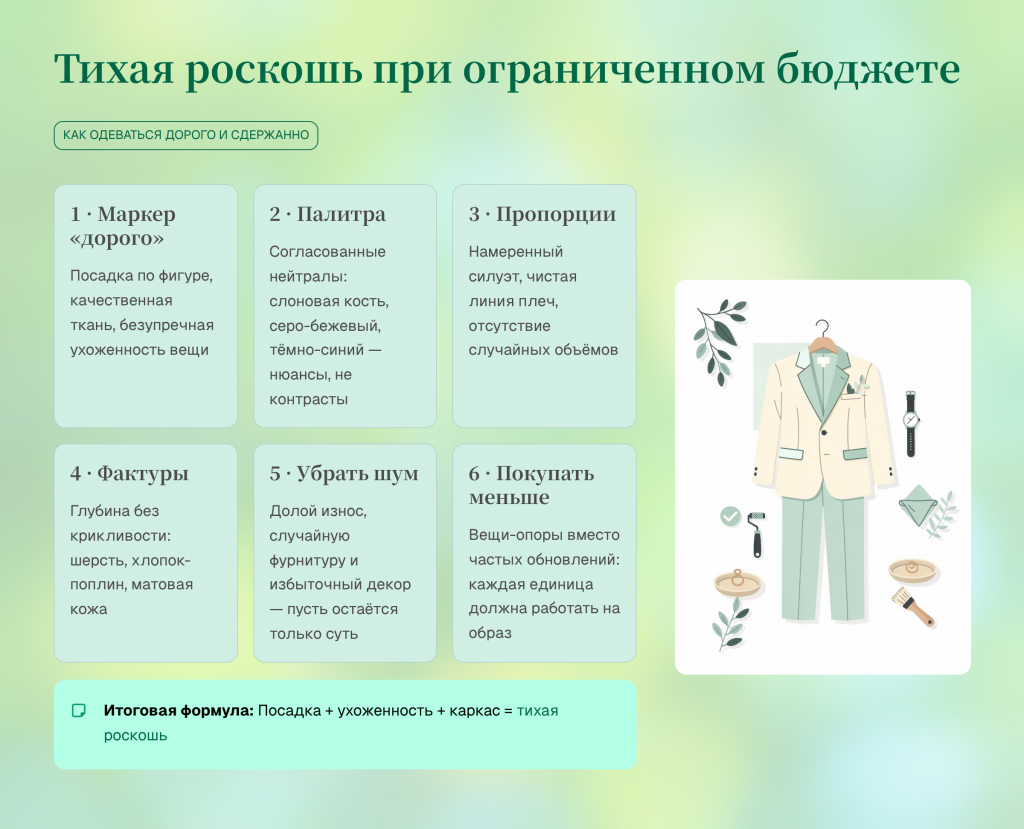 Тихая роскошь при ограниченном бюджете строится не на трендах и не на «правильных цветах», а на дисциплине впечатления: посадке, ткани, ухоженности и чистых пропорциях. Сдержанность здесь не означает скуку, она означает отсутствие визуального шума и конфликтов. Когда оттенки согласованы, линии намеренны, а детали не удешевляют, образ выглядит дороже даже без дорогих брендов. В бюджете особенно выигрывает стратегия «меньше, но лучше»: несколько опорных вещей, которые держат форму и сочетаются, дают больше статуса, чем постоянные случайные обновления.