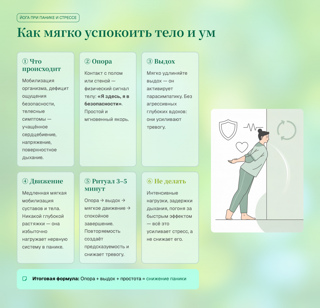Самое полезное — иметь короткий ритуал, который можно выполнить без подготовки: опора, несколько выдохов, мягкое движение, минутное завершение. Такой ритуал не обещает мгновенного «исчезновения паники», но возвращает управляемость и снижает страх перед собственными симптомами. Когда практика становится бережной и повторяемой, она превращается в инструмент первой помощи — тихий, безопасный и доступный.